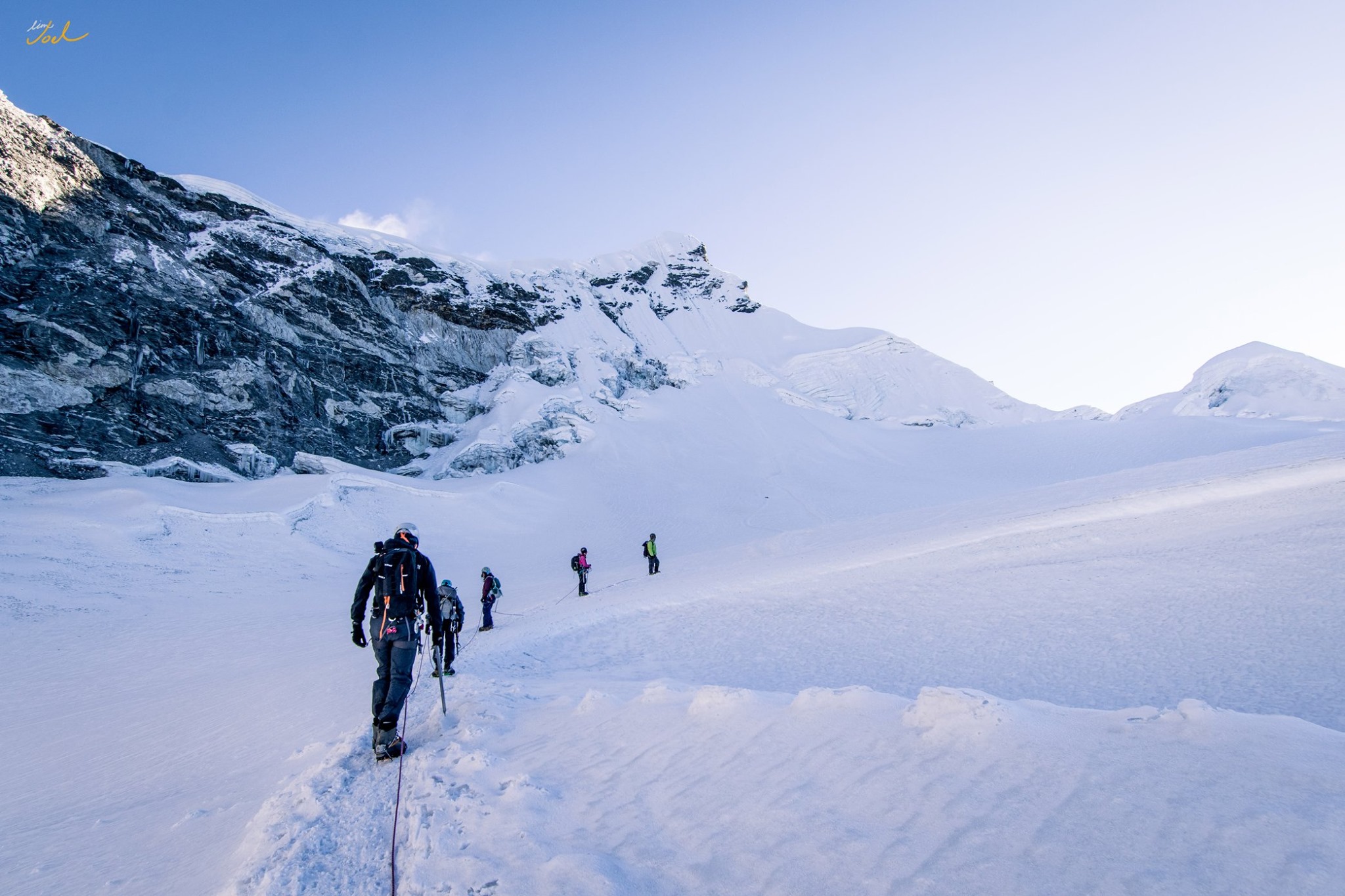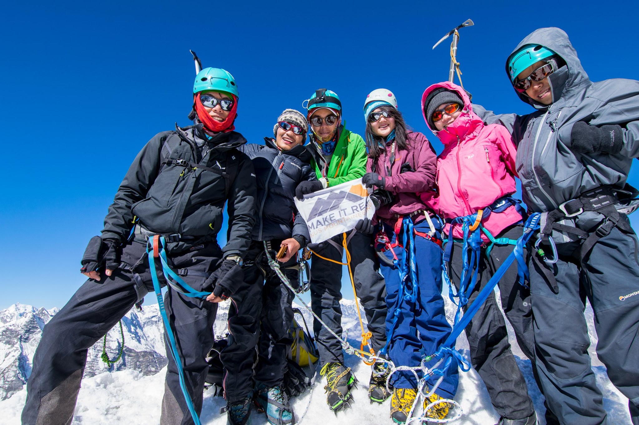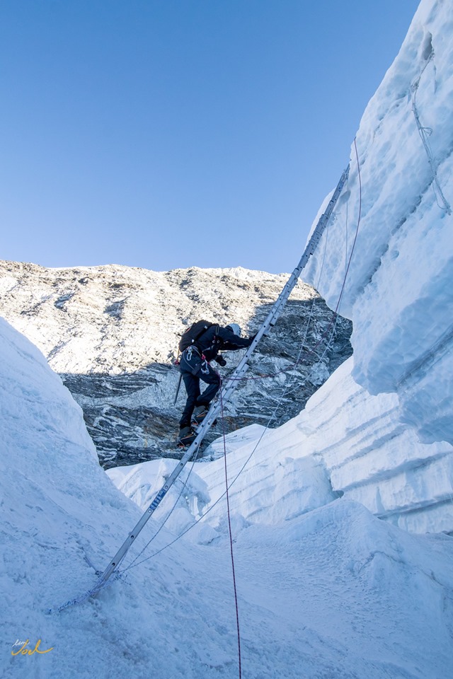 We made for the summit on 21 May 2019 at midnight. The climb was an 800m ascent, scrambling over loose rocks till we hit crampon point. Then there were about 4 ladder crossing sections amidst giant crevasses. About an hour later we hit the 300m jumar wall that was about 70-80 degrees steep. We made for the summit between 0720 – 0930 hrs and surpassed two other teams.
