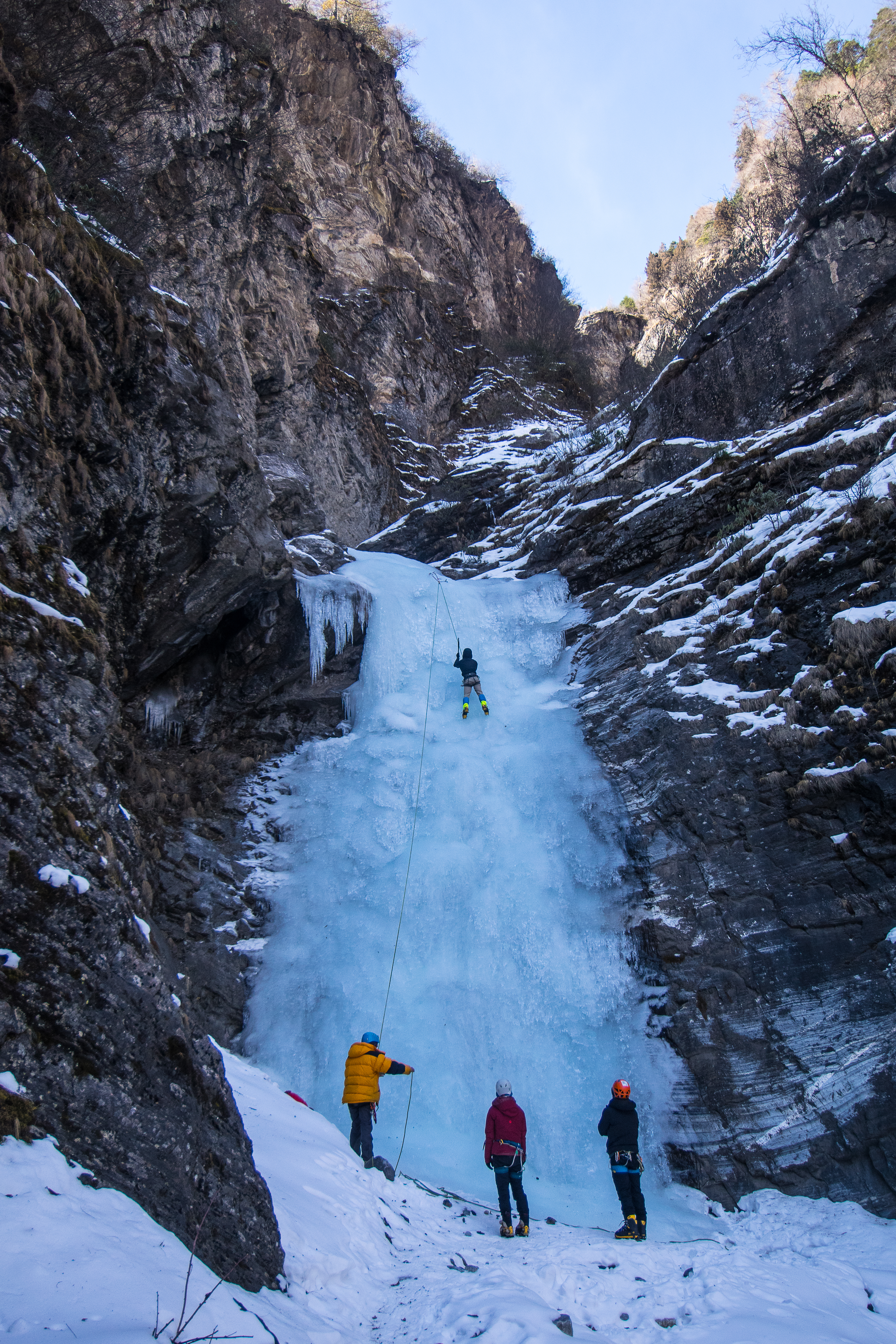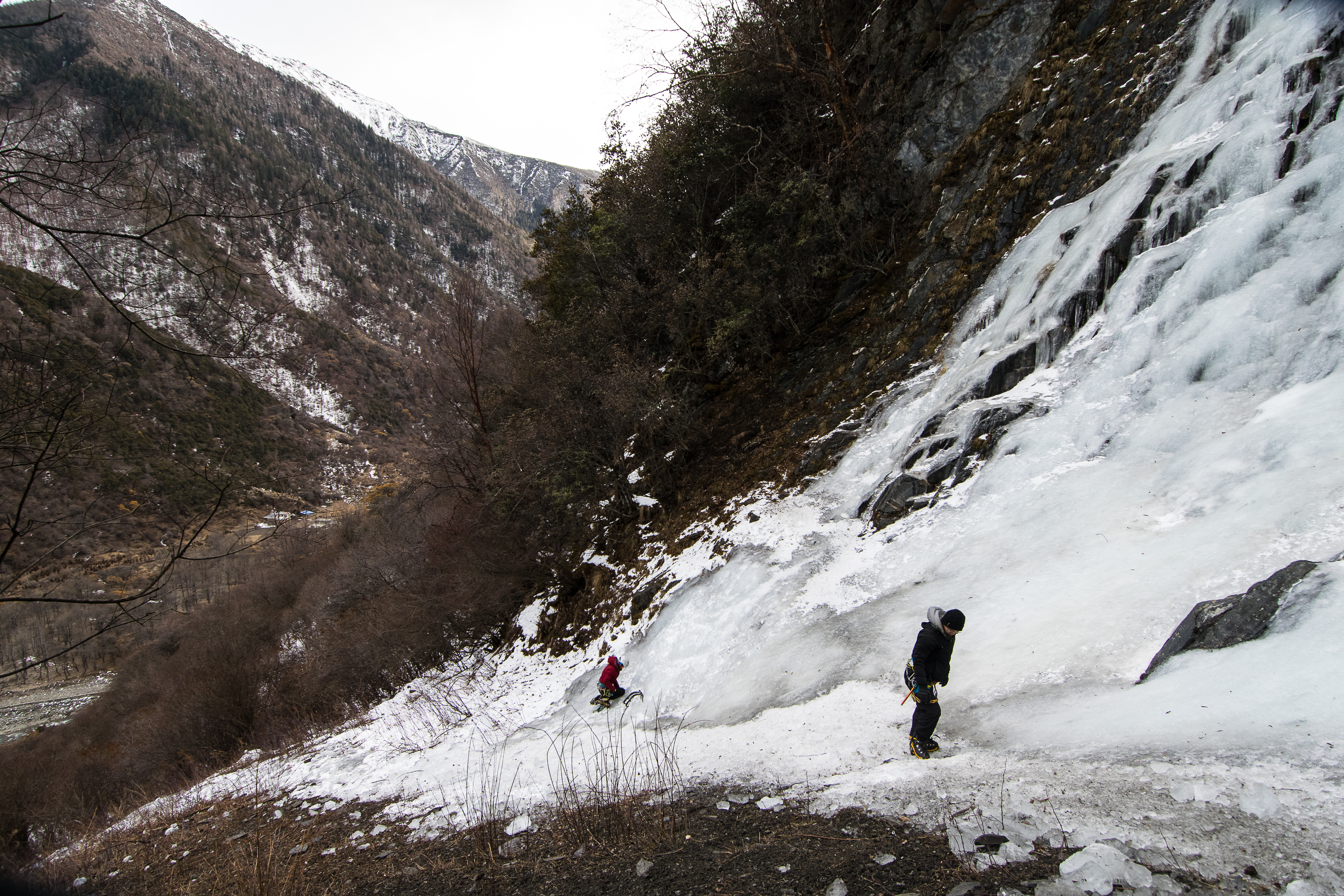 Our plan was to lead on our own and figure out ice climbing all by ourselves without any guide. We had a full week here and all we were going to do was climb. After our 4 hour drive from Chengdu to the valley, we dropped our bags and made our way to the first waterfall outside our hotel. This was 无色 (Wu Se – Five colors). Within the 2 hours of daylight left, I gumbied my way up 5 metres to build a tiny top rope practice lane for us. This was probably on a 70 degree incline.