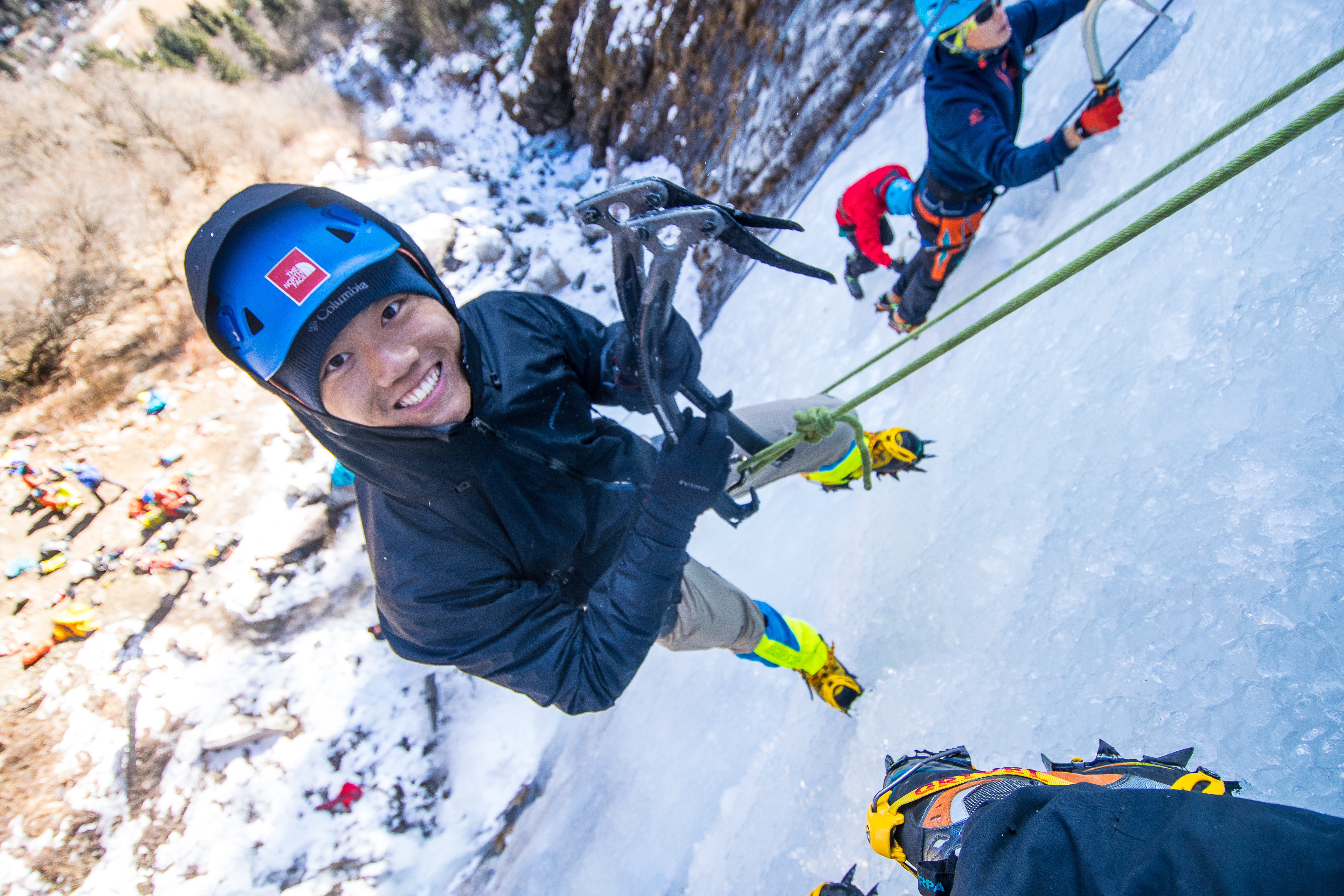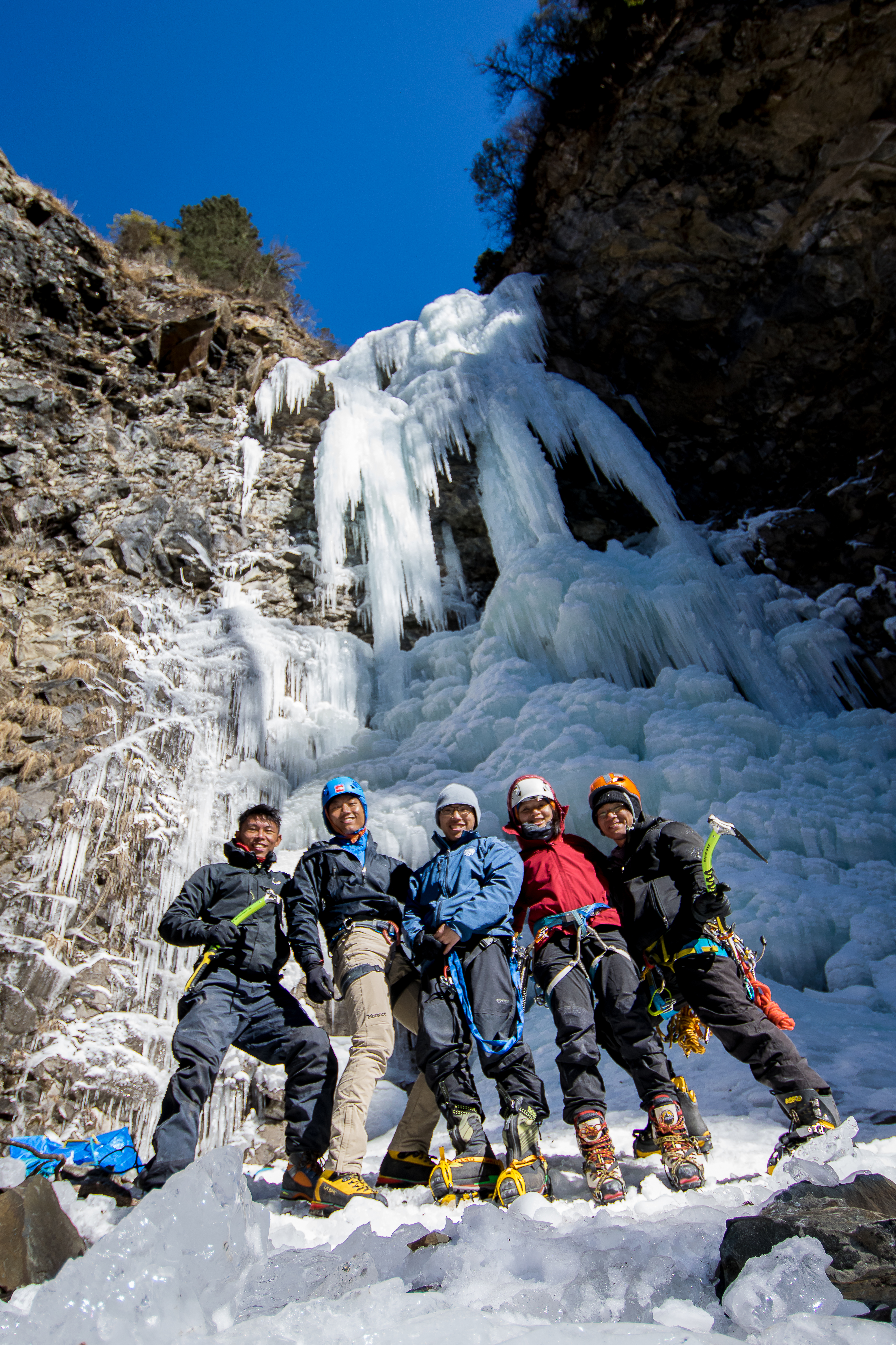 The fifth day we tried 雪山老屋 (Xue Shan Lao Wu – Old Hut in the Snow Mountain), it was also a WI3-ish climb that involved an approached that required ice climbing. We were told that winter was warmer this year, else we could go up higher and find more waterfalls. This day we gained momentum in our training and we all made 4/5 laps up this short waterfall to practise our technique.