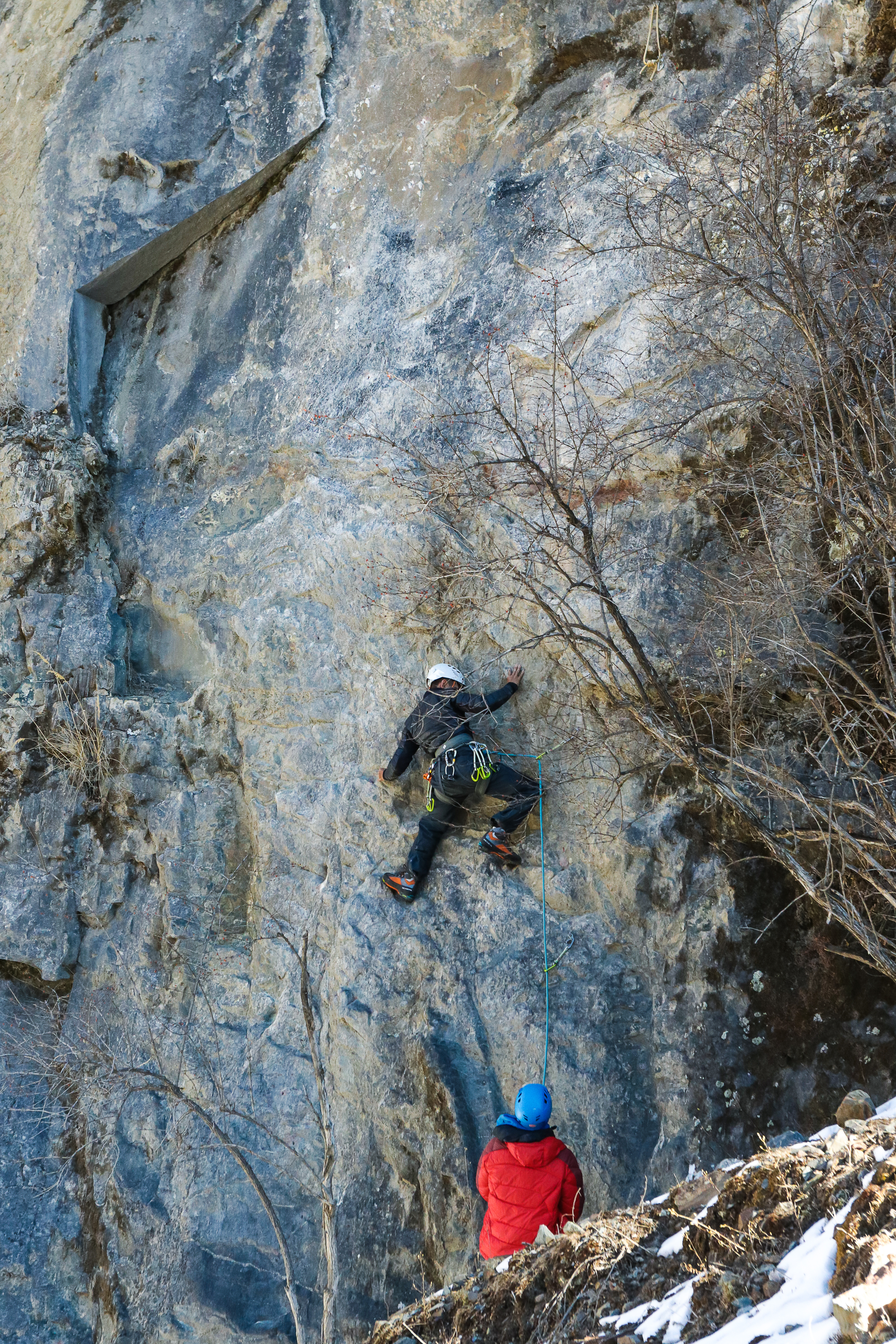 The second half of that day, we tried out dry tooling. Little bits of rock were chiseled out for our ice tools to be placed. Such areas are usually chosen because they are more chossy. Ethics dictate that good rock climbing areas are reserved for rock climbing, so you would not see chiseled out mono holds on good climbing areas. Mono point crampons had to be used in order to step in the same mono holds. 邓老师 stepped aside from this section and we had to set up our own ropes. I decided that the prospect of taking a fall with ice tools flailing about was too dangerous for me on first go, so I rock climbed up.